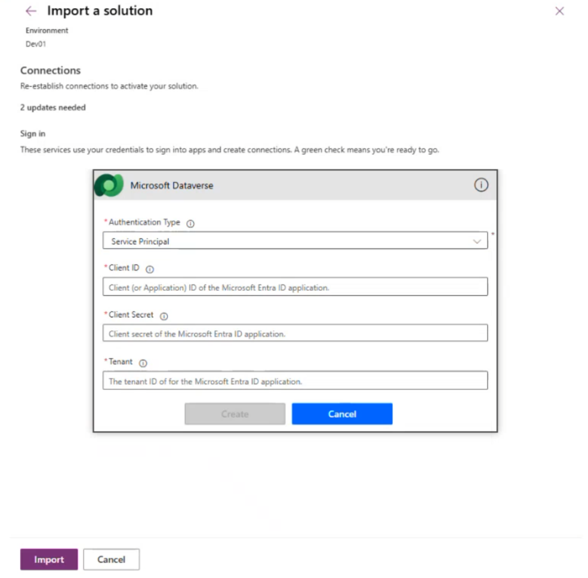 - During the application solution import process, you will be prompted to enter your connection credentials. Click on the "Create" button.