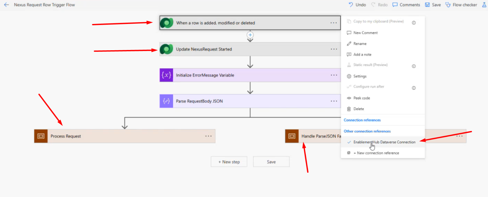 - Select the appropriate connector (e.g., Dataverse (Current environment) or Custom Connector)